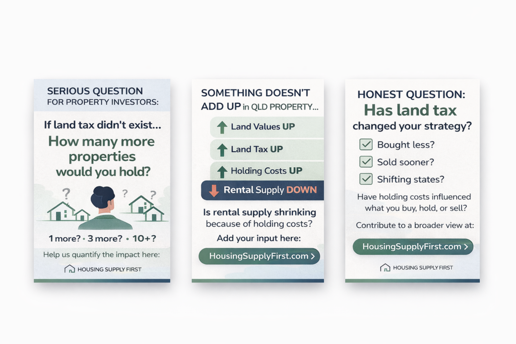 The Housing Supply First initiative is currently collecting direct feedback from investors and industry participants on how land tax and holding costs are influencing behaviour with residential investors. Ultimately, we need to have the Government reduce or eliminate tax on residential rental property ownership.